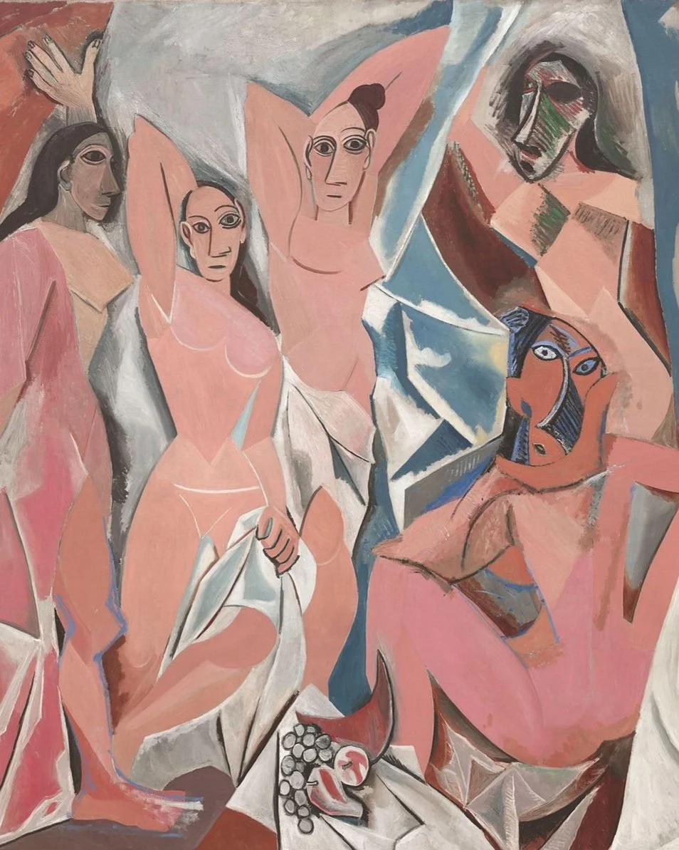 Les Demoiselles d'Avignon (“The Young Ladies of Avignon”, and originally titled “The Brothel of Avignon”) (1907), which depicts five naked women, each composed of flat, splintered planes, is perhaps the most radical painting of the twentieth century; breaking entirely from traditional composition and perspective painting, it revolutionised the way in which artists saw and transformed reality. Though hard to understand today, the painting proved so utterly controversial that when it was first exhibited, artist André Derain (1880-1954), himself no stranger to seeking out new modes of representation, having co-founded Fauvism with Henri Matisse (1869-1954), suggested to Picasso that he would one day kill himself for the shame he had brought on the art establishment. Originally, Les Demoiselles was going to be an allegory of venereal disease entitled “The Wages of Sin”, and in an early study, Picasso sketched a sailor carousing in a brothel amongst prostitutes and a young medical student holding a skull, which was a symbol for mortality. The subsequent painting is of course far simpler, and only women appear, but they’re far from the sort of classically idealised feminine beauty as depicted in for e.g. Ingres’ (1780-1867) Venus Anadyomene (1848) and at the same time, bear no resemblance to those “traditional nudes” viewers had become accustomed to seeing in the 1880s when Degas (1834-1917) and Toulouse-Lautrec (1864-1901) had begun to capture them in the moment of the “parade” (whereby prostitutes announced their wares and services to clients). Picasso wanted to find an artistic language capable of expressing a rapidly changing world, and in depicting this new reality he chose to abandon harmonious bodily proportions. As an aside, Les Demoiselles is also an interesting example of how the canon of art history is inextricably woven together through time; the faces of three of the women were derived from the pre-Roman Iberian bronzes Picasso had seen at the Louvre (the other two inspired by African masks), which in themselves visibly reflect classical Greek and Phoenician ideals of physical perfection. Yet, unlike their forebears, the faces of these women are sharp and knife-like, self-possessed and looking directly at the viewer, no longer there solely for the pleasure of the male gaze. In this respect, Picasso has often been characterised as a misogynist, a man who feared as well as desired the female form (Dora Maar (1907-1997) was perhaps the only one of Picasso’s lovers to have escaped emotionally intact) and some have suggested their bodies, which appear almost sharp to the touch, are reflective of this inner turmoil. As art critic Robert Hughes (1938-2012) so succinctly put it, “No painter put his anxiety about impotence and castration more plainly than Picasso did in Les Demoiselles, or projected it through a more violent dislocation of form. Even the melon, that sweet and pulpy fruit, looks like a weapon”.