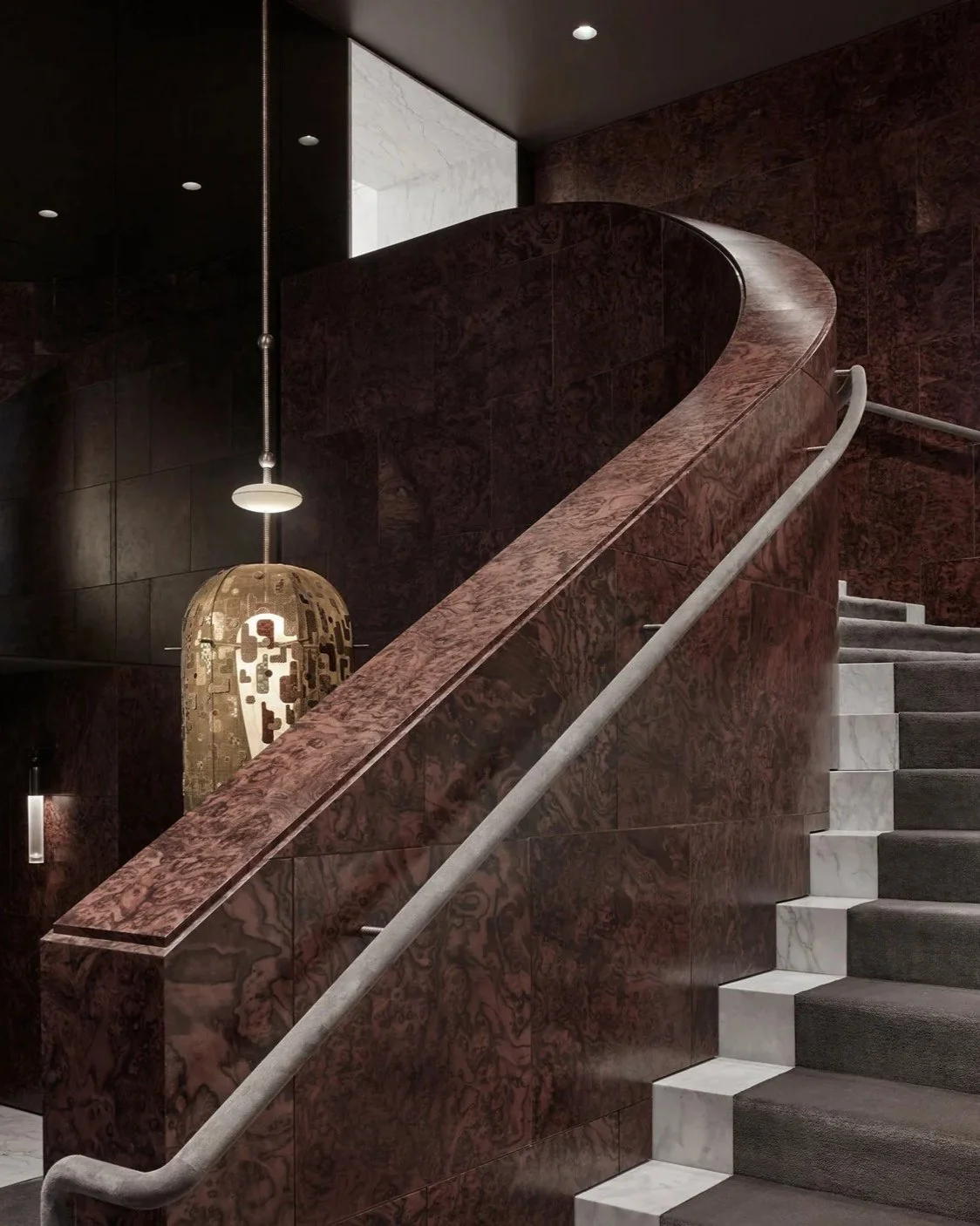Apparatus Studio's monumental hand-embroidered “Interlude” hanging lamp, illuminating the sweeping Villa Necchi-esque staircase at their recently opened Mayfair showroom, image c/o Apparatus