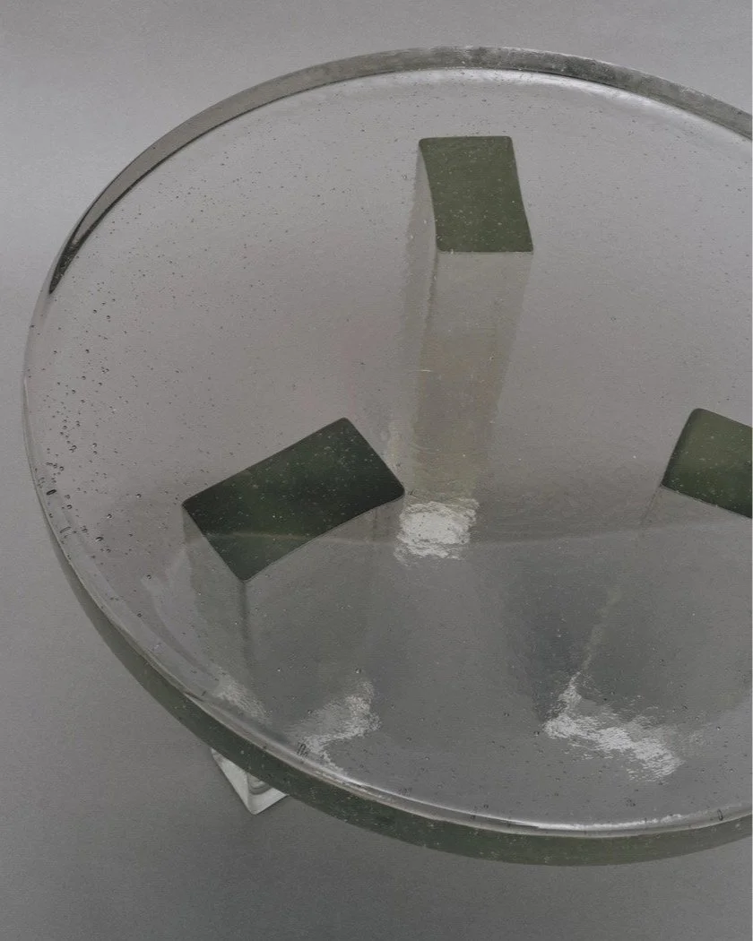 Courtney Applebaum’s monolithic, slab-like “Seeded Glass” table, evocative of thick Saint-Gobain tabletops beloved by French modernists such as Chareau and Jacques Adnet, image c/o Seventh House Gallery