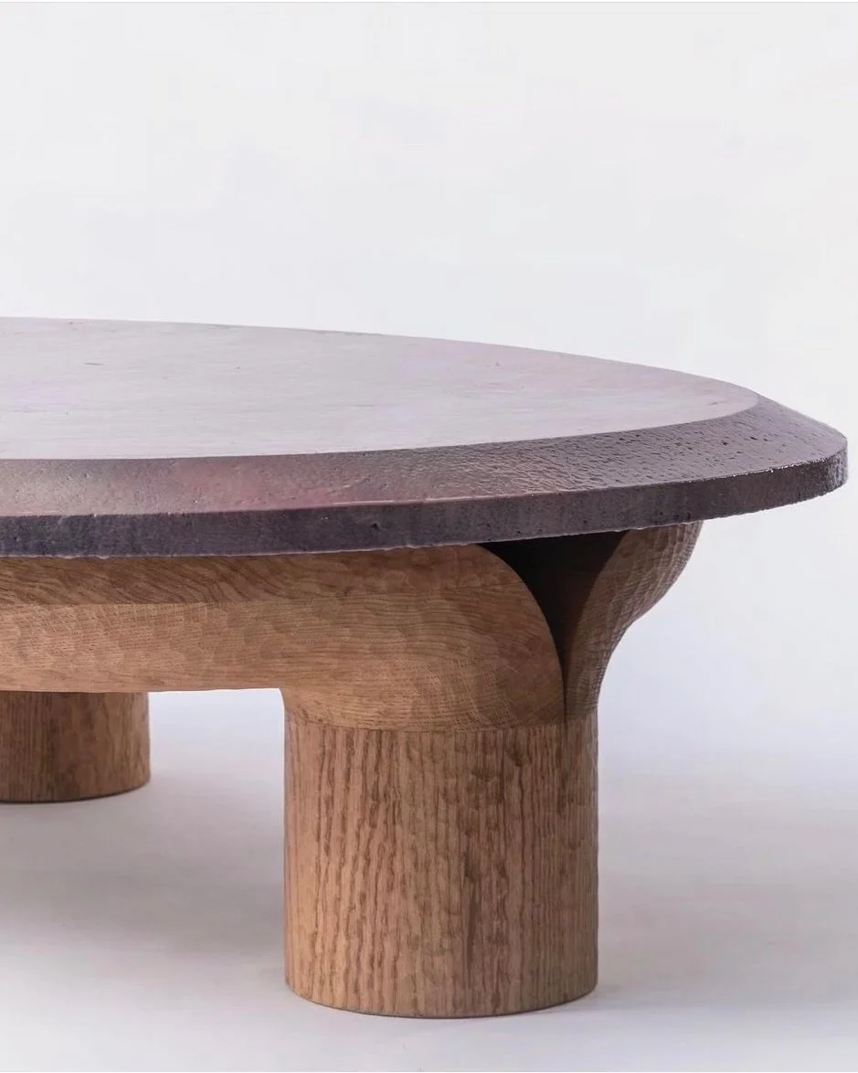 Ian Felton’s “Sacha” coffee table, named after the Quechua word for “Tree”, with its root like, rough-hewn oak base and glazed lava stone top, evocative of submerged Cora, image c/o Ian Felton