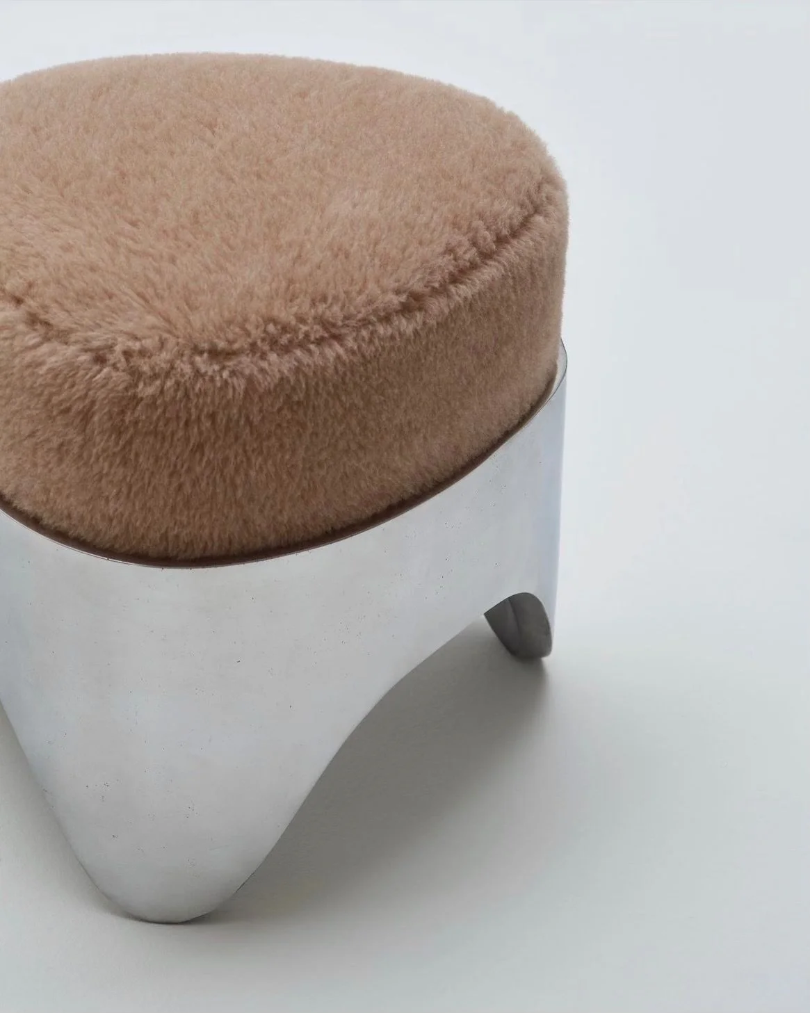 New York-based decorator and designer Brett Robinson’s cast aluminium stool, upholstered in plush alpaca, its undulating lines reminiscent of Mark Newson’s “Orgone” collection, image c/o RG Brett